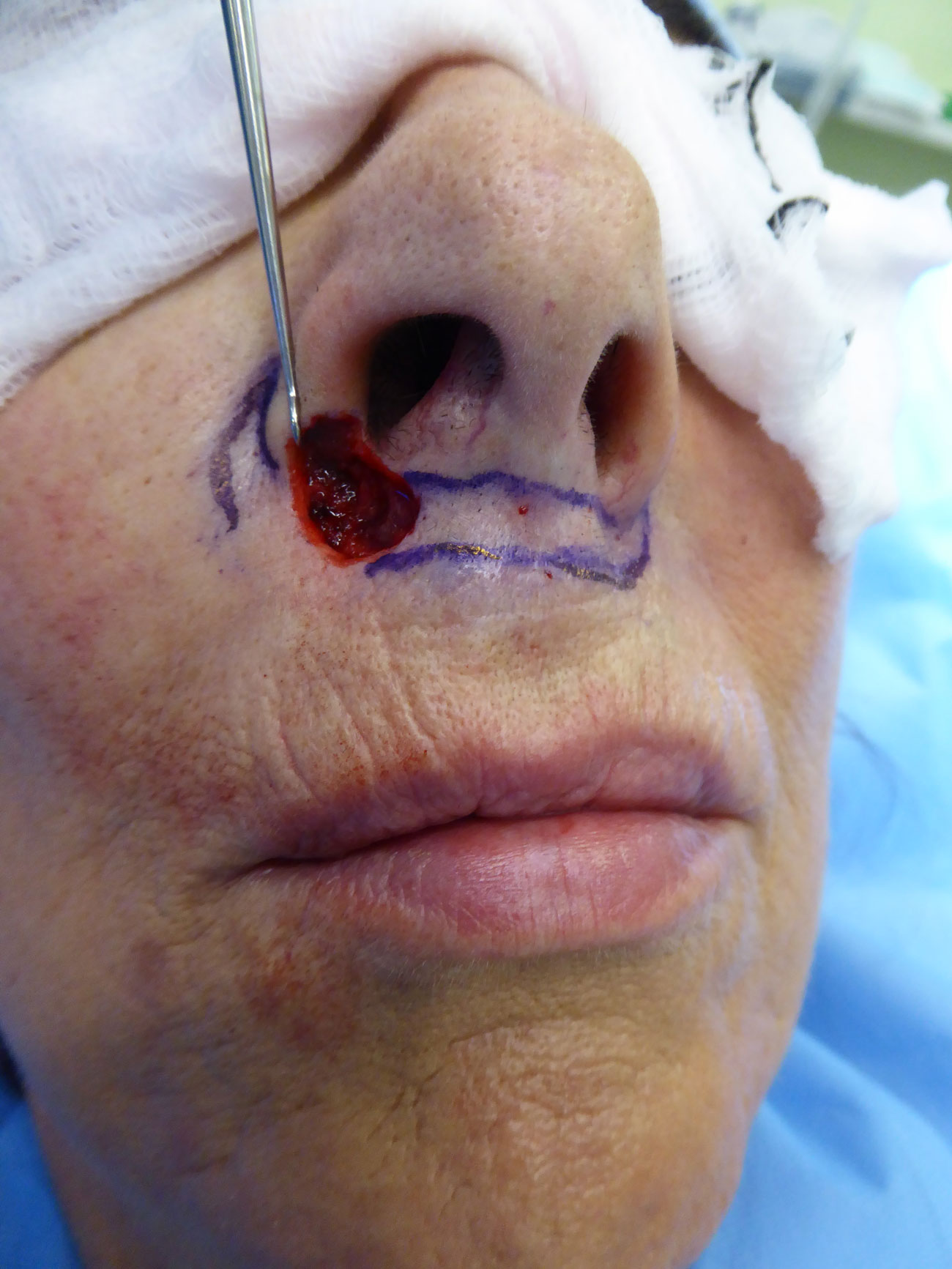 This 54-year-old female patient had a basal cell carcinoma (BCC) excised from the junction of her right upper lip and nasal sill, with the BCC extending onto the lower rim of her right nasal alar (Figure 1). The patient wanted a hidden scar, no lip asymmetry, and was keen to avoid a skin graft or visible flap. She had a long philtral height of 16mm and an upper lip labial height of 4mm. She was therefore a good candidate for lip lift surgery as her philtral-labial score (philtral height divided by labial height) was four.