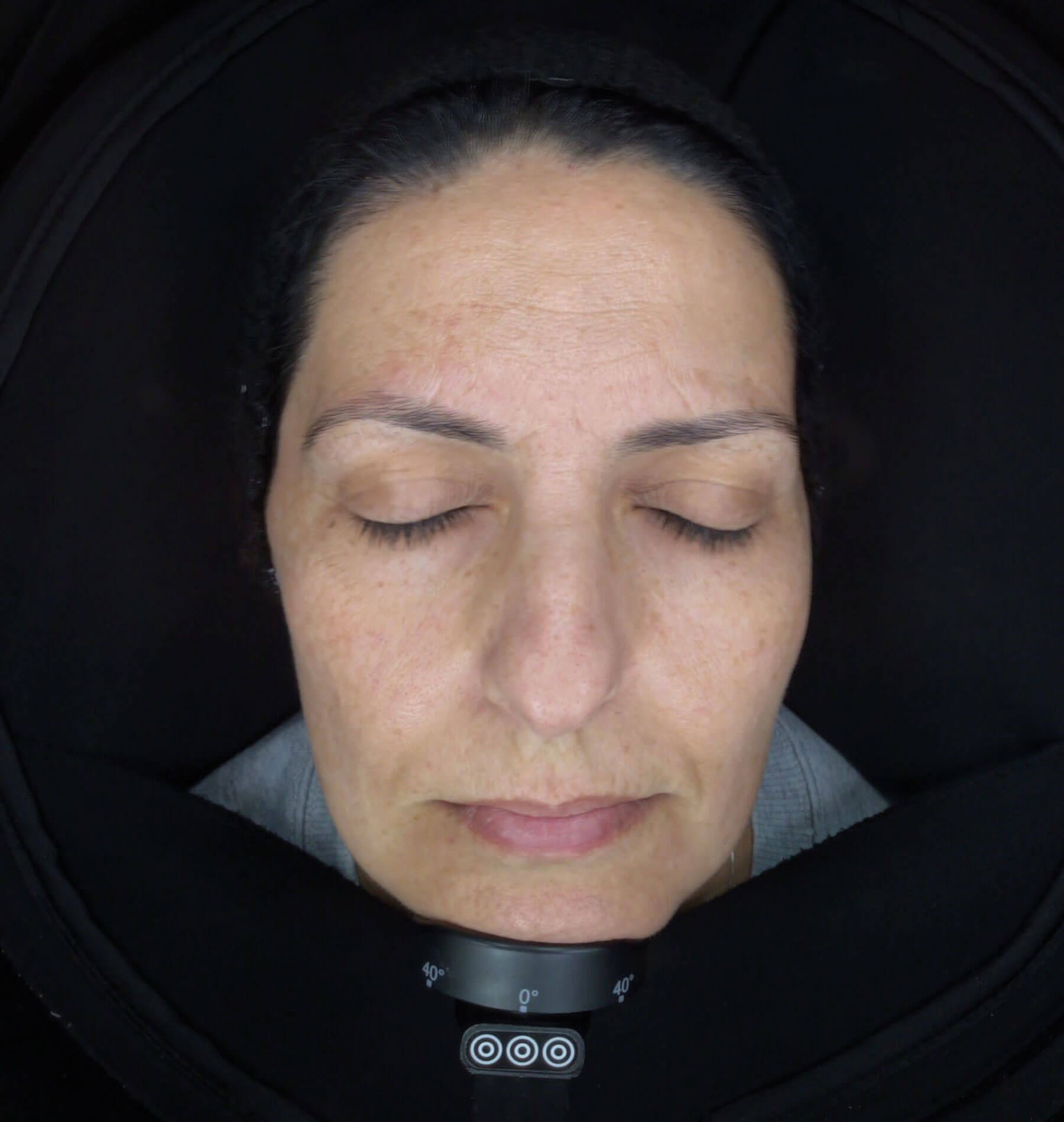 The facial skin appeared light and bright, with a significant reduction of melasma hyperpigmentation over the entire face, and this was particularly apparent on the forehead and cheeks. The patient has demonstrated a very good compliance with the treatment. She reported that she had only a moderate erythema after the ambulatory sessions with no crusting or massive exfoliation.