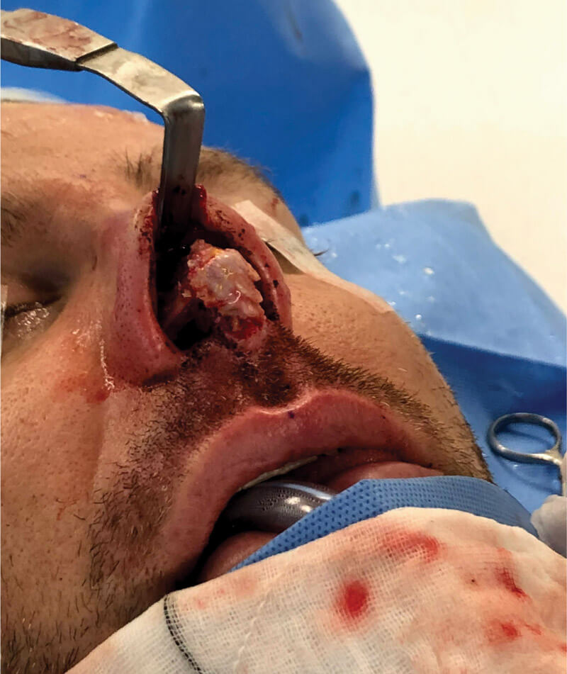 Numerous graft materials have been developed for use in rhinoplasty procedures in order to give or improve the contour and hide irregularities [1]. These range from autologous grafts, homografts including acellular dermal matrix (ADM), irradiated cartilage and alloplastic materials.