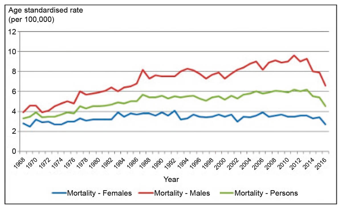 Figure 1: Age-standardised mortality rates for melanoma skin cancer, 1968 to 2016, by sex.