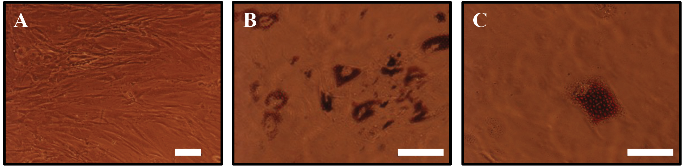 Figure 2: Adipose derived stem cells differentiated towards the adipogenic lineage.(A) Adipose derived stem cells display a fibroblast like morphology. (B, C) ADSCs differentiated towards the adipogenic lineage at different magnifications after culture in adipogenic differentiation medium for 10 days clearly shows cells accumulating lipid droplets. The droplets were stained with Oil Red O, a fat soluble dye. Scale bar (A, B) is 100µm and (C) 50µm.