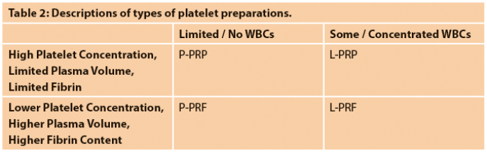 PRP by definition has a platelet concentration at least five times greater than peripheral blood; in order to attain this, the volume is generally quite small with minimal to weak fibrin polymerisation. Platelet rich fibrin (PRF) has a larger volume and does not have as high a platelet concentration as PRP. Both PRP and PRF can have a minimal leukocyte fraction (‘pure’) or may contain a significant population of leukocytes (‘leukocyte- rich’). This classification divides platelet preparations into four categories: P-PRP, L-PRP, P-PRF and L-PRF (Table 2) [2]. The optimal platelet preparation is yet to be determined.