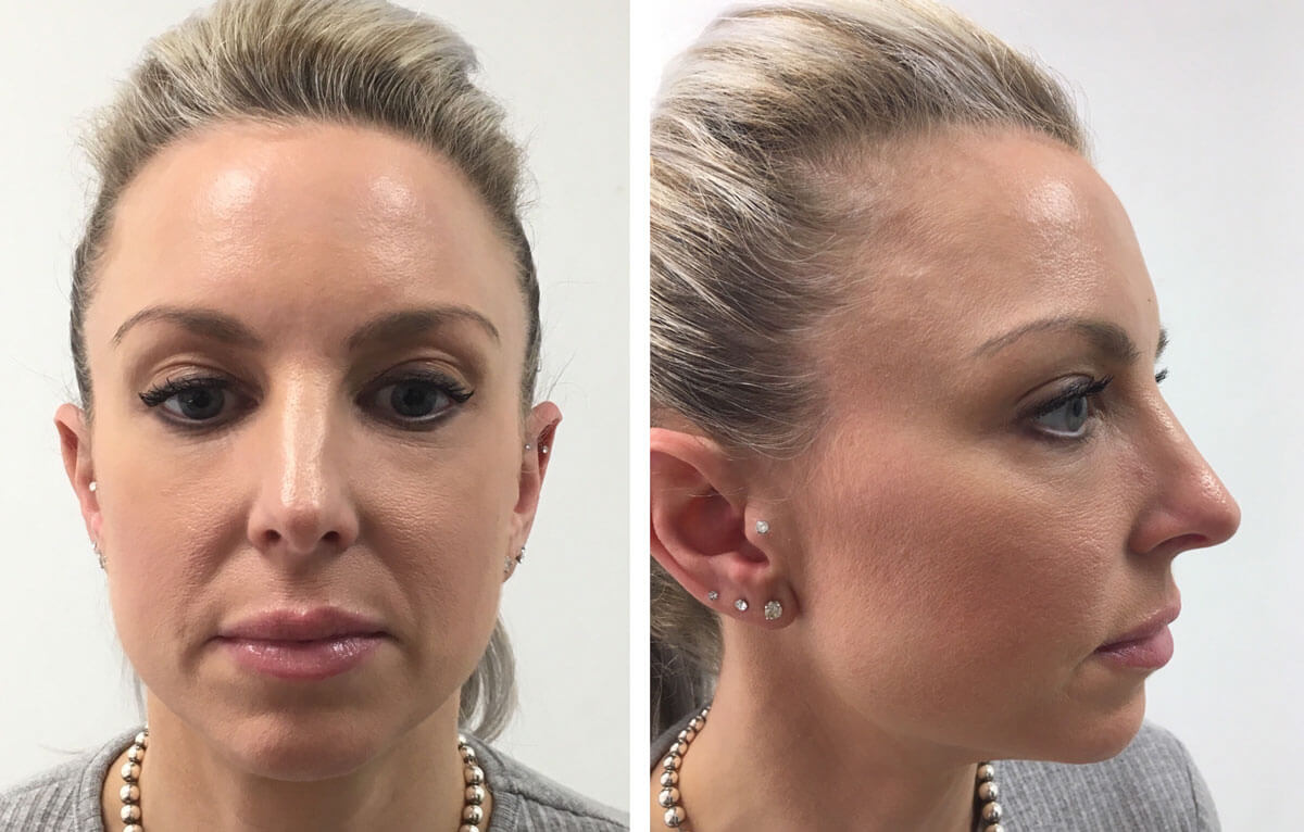 She was treated with hyaluronidase injection on three occasions over a period of eight weeks. 350IU of hyaluronidase was injected under each eye on each of the first two sessions, and 250IU was injected under each eye on the third session. Hyaluronidase was injected in the supraperiosteal, intramuscular and subcutaneous planes as well as directly into any areas of thickening, and the area was massaged. There was mild bruising and short-lived oedema following injections. The patient reported partial improvements after the first and second treatments, and complete resolution was noted four weeks after the third treatment. (Figure 4) and the patient reported satisfaction with the appearance of her face.