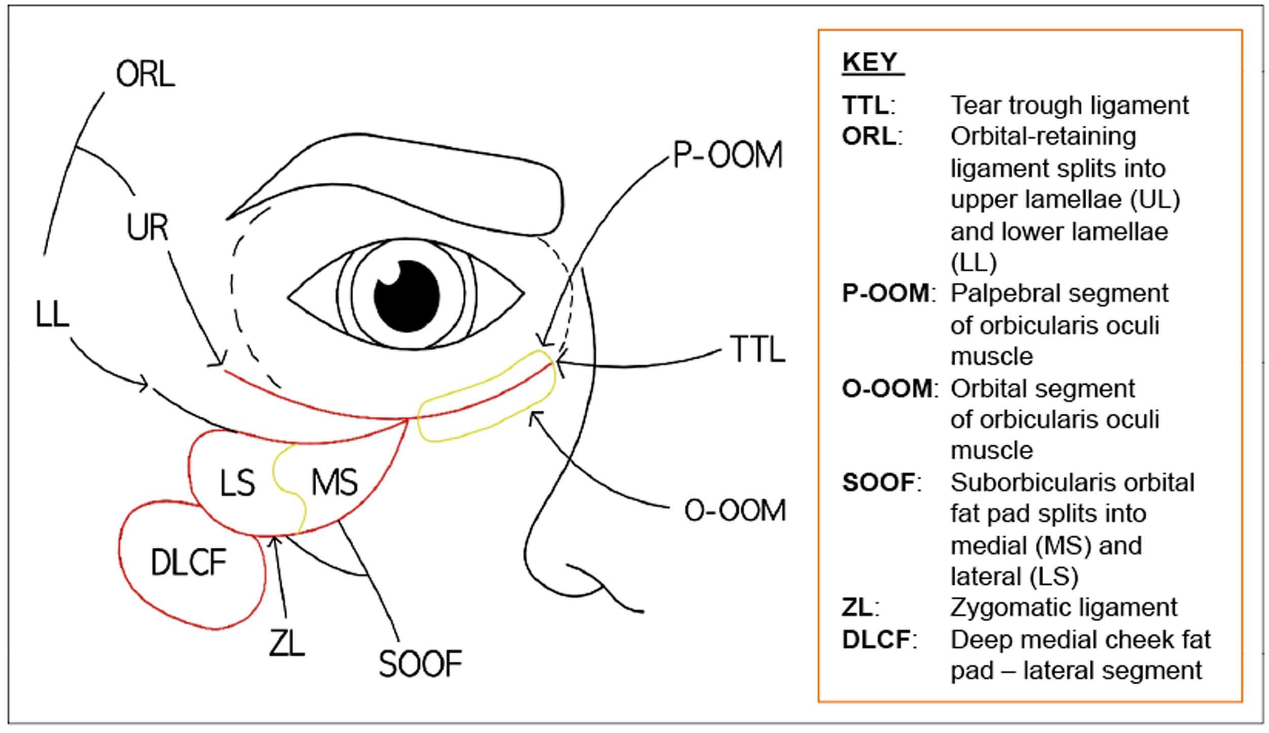 The orbital-retaining ligament is a continuation of the tear trough ligament and splits into two parts. It starts at the mid-pupillary line and extends roughly 15mm laterally [3]. The ligament mainly serves to attach the orbicularis oculi muscle to the orbital rim and also forms the superior border of the suborbicularis orbital fat pad (SOOF) [3].