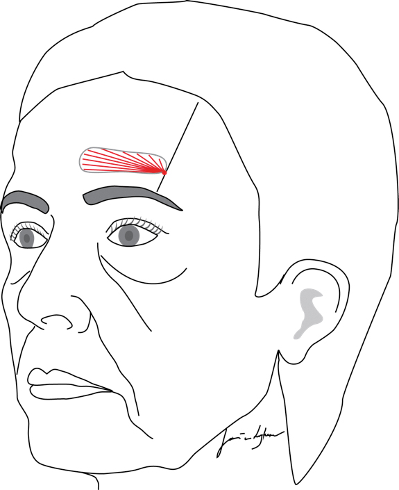 Figure 1: Schematic drawing of product injection at the frontal concavity. The straight line marks the medial border of the temporal crest. The red dot marks 1-2cm above the orbital rim and the red lines indicate the subgaleal retrograde linear threads of soft-tissue filler.
