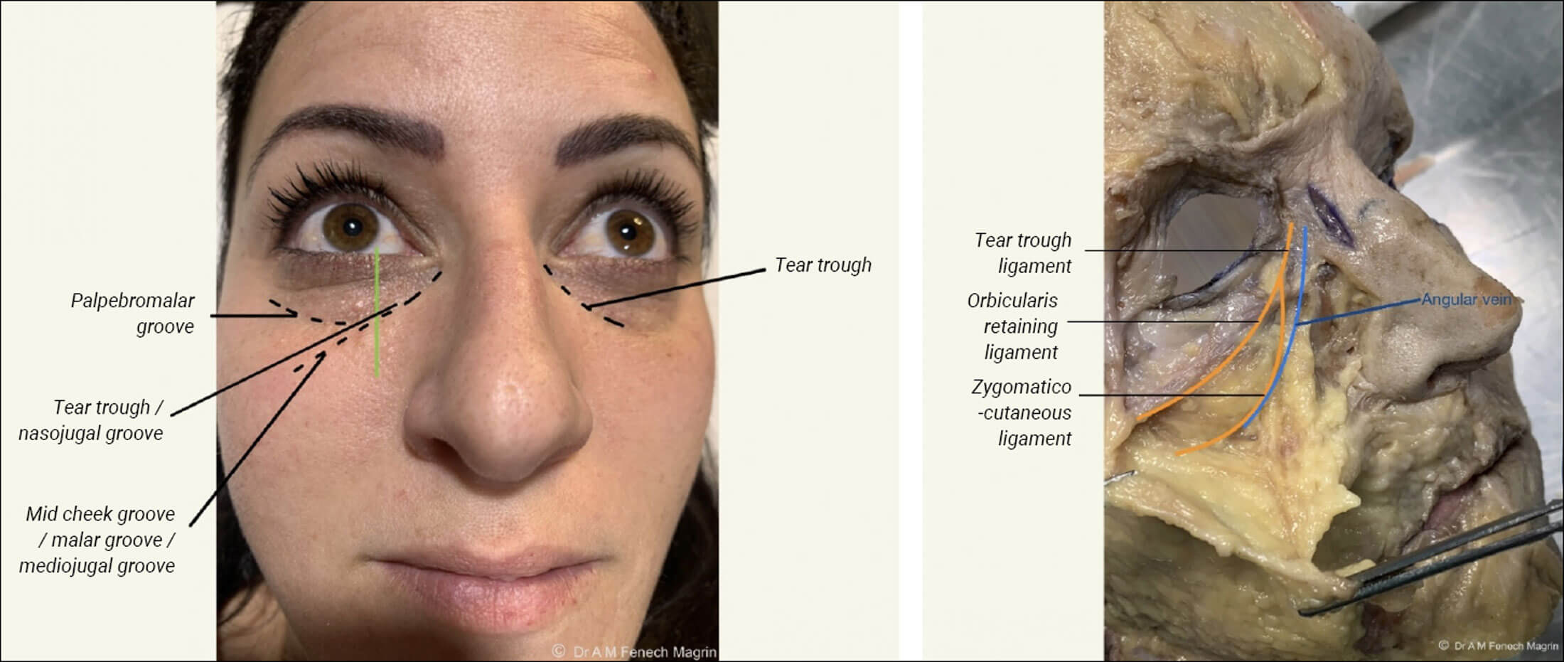 The nasojugal groove (the tear trough) and the palpebromalar groove (lid-cheek groove) form a ‘V’ shaped deformity with increasing age. These two grooves connect to become a continuous groove that sharply demarcates the bulging orbital fat above, from the retruded midcheek below. The resulting demarcation of these grooves is determined by the attachment of the underlying ligaments.