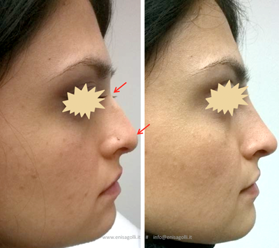 - Correction of the shape: the profile of the ‘saddle’ or ‘sunken’ nose, the straightening of the apparent nasal hump, the remodeling and lifting of the tip pointing downwards.