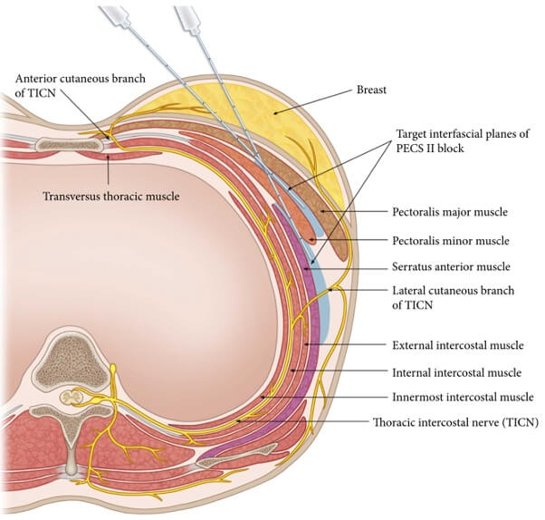 Pecs I and Pecs II, shown in Figure 4, are blocks of the superficial thoracic wall to provide analgesia for breast and anterior chest wall surgery [15]. Pecs I involves infiltration of local anaesthetic between pectoralis major and minor to anaesthetise the medial and lateral pectoral nerves. This block would be indicated for a patient undergoing submuscular tissue expander or implant placement. However, this block does not anaesthetise the breast tissue or overlying skin. A Pecs II block includes the Pecs I area as well as the intercostal and long thoracic nerves by infiltrating between pectoralis minor and serratus anterior. This block provides anaesthesia to the breast and axillary tissue as well as the breast skin. This block is typically performed by an anaesthesiologist under ultrasound guidance [13,16].