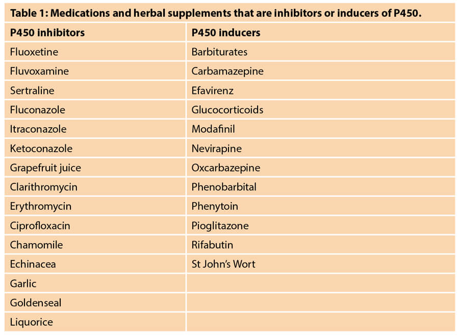 Lidocaine is primarily metabolised by the liver with the cytochrome P450 system of enzymes. Therefore, patients with altered hepatic flow such as those with liver abnormalities, such as cirrhosis, or congestive heart failure have increased risk of toxicity with amide local anaesthetics. Additionally, medications that affect the P450 enzymes will ultimately impact lidocaine serum concentrations. Table 1 includes a list of various medications and herbal supplements that inhibit or induce P450 enzymes [4,5]. Medications that inhibit P450 will inhibit the metabolism of lidocaine, while medications that induce P450 will increase the metabolism of lidocaine. It is recommended that these medications be held at least two weeks prior to procedures using tumescent technique where high doses of lidocaine are anticipated.