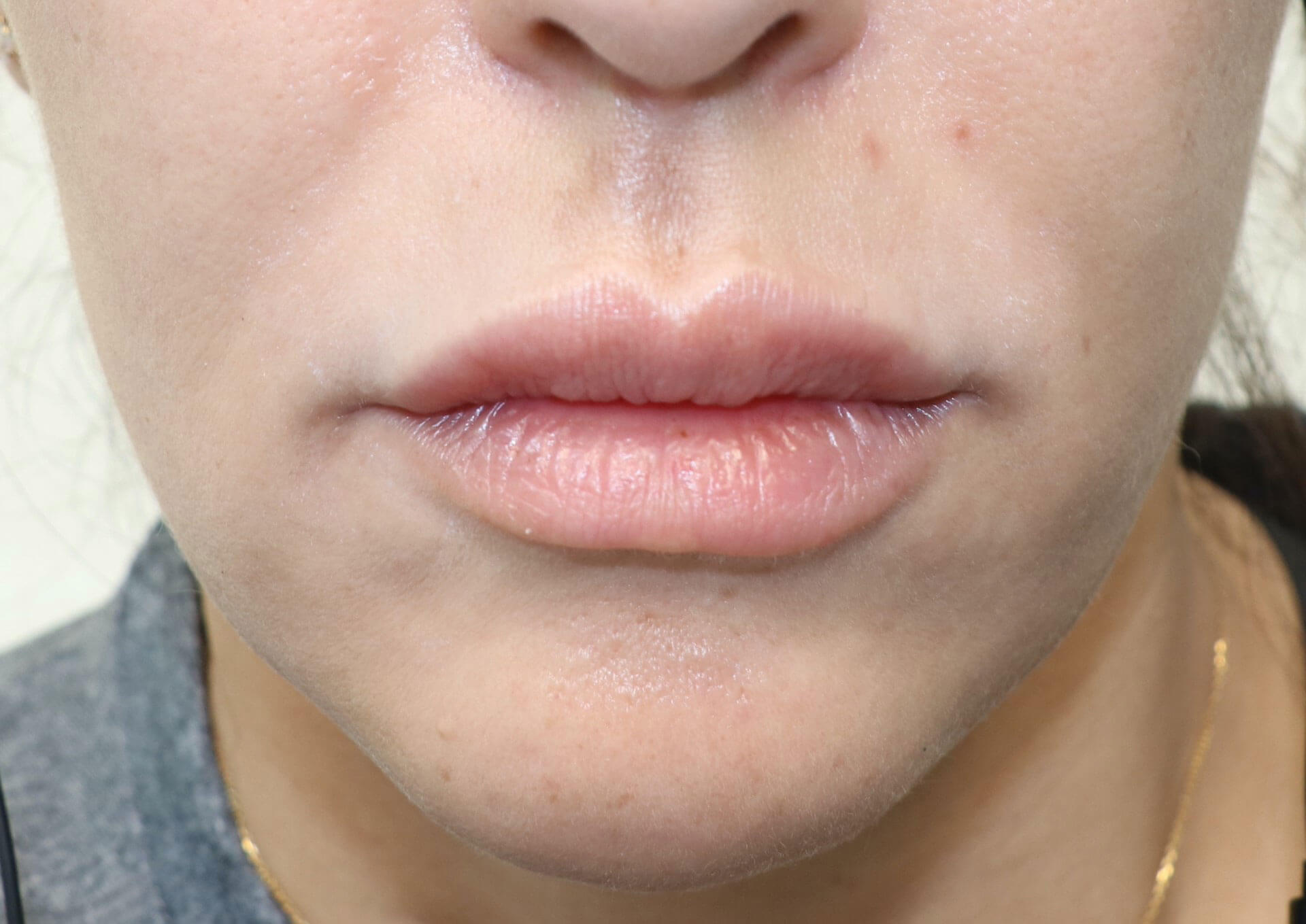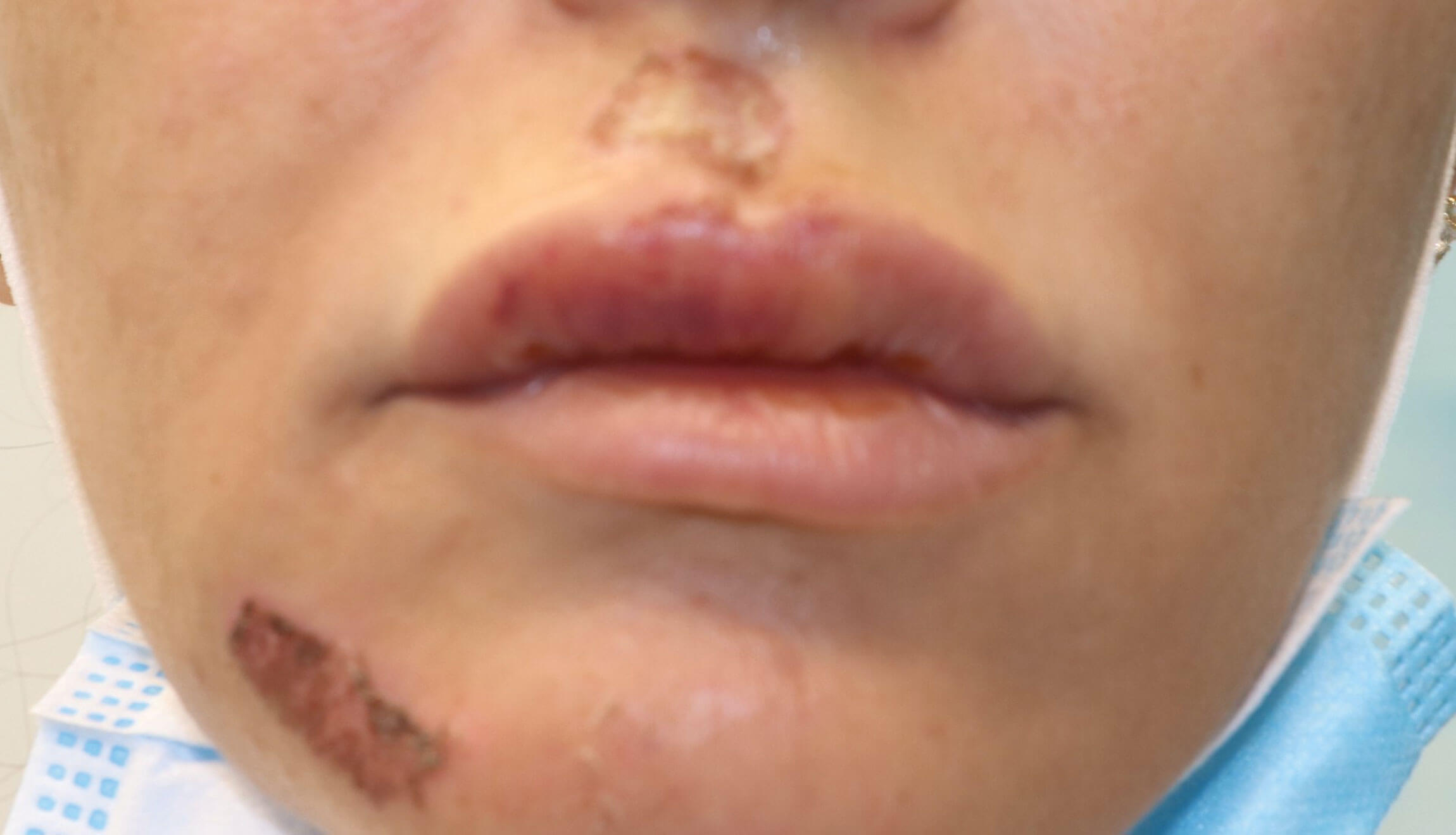 Case B: A female patient sustained injuries above her upper lip and on the right side of the chin due to a bike fall (Figure 3).