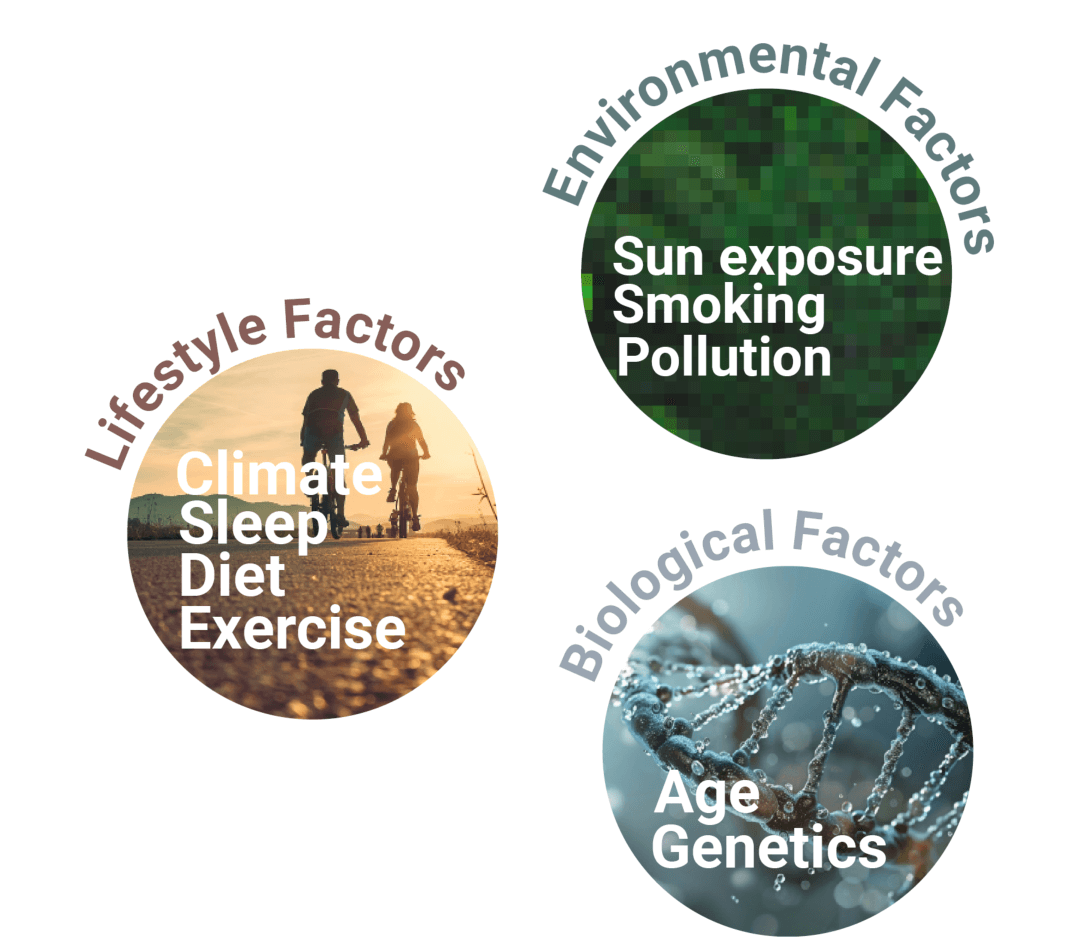 Biological, environmental and lifestyle factors are the main interacting factors responsible for changes in skin appearance and ageing. Understanding how these different factors affect our skin’s health and what can be done to prevent them, can promote and prolong overall skin health and help to counter the skin ageing phenotype.