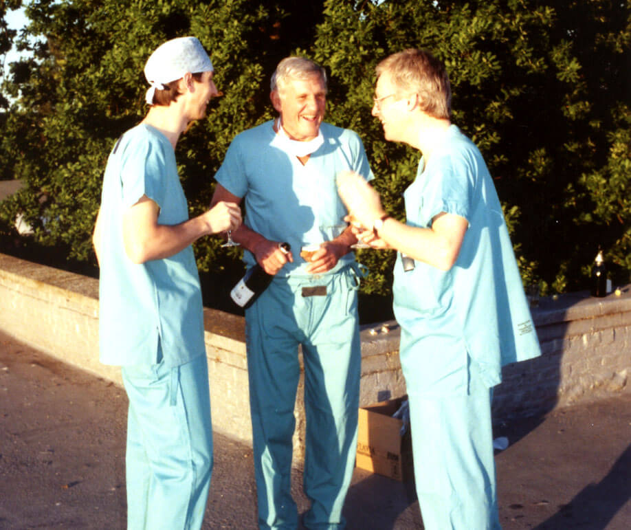 From left to right: David Gault, Michael Hackett and James Frame in 1988 celebrating a successful