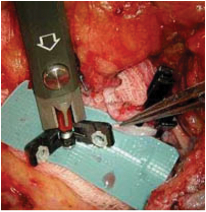 Figure 2: Intraoperative view of venous coupler device on the left of the photograph prior to anastomosis of the veins, one of which is seen held on the right of the picture.