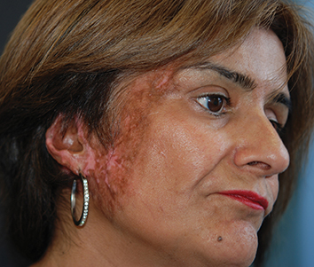 Another technique that is used to help restore colour, minimise the visual appearance of scars following trauma, burns or reconstructive surgery is with the use of skin camouflage creams or powders (Figure 4) such as Dermacolor, Veil and Kerromask. In order to use these products with success, specialist training in skin camouflage was provided by the British Red Cross. This can also play an important role in the patient’s journey in conjunction with other scar therapy interventions, such as pressure garments and topical silicone gels / sheets. Using these interventions can improve a patient’s quality of life and their ability to feel confident with social interaction.