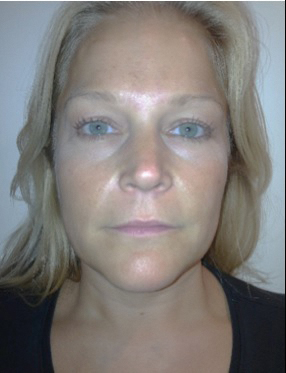 Figure 4 shows photographs of a 37-year-old Caucasian woman, with a tender bilateral masseteric enlargement. She was medically well with no dental or psychological implications in her presenting features. Aetiology of the hypertrophy was considered to be stress-related clenching giving myofascial TMD. Firm, well-defined masseters were palpable on clenching with focal tenderness at the centre. There was no associated temporalis or pterygoid involvement. An injection of 30 units of BtxA was made to each muscle. The patient reported reduction in pain symptoms and drastic slimming of the face as demonstrated in the clinical photographs. Clinical palpation post-treatment revealed reduction in muscle strength with high patient satisfaction levels.