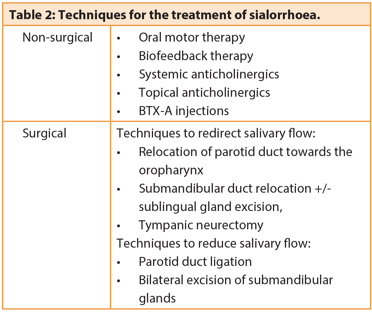 However, in children with cerebral palsy, the injections are typically performed under general anaesthesia. The effectiveness of BTX-A in the treatment of sialorrhoeoa associated with cerebral palsy and Parkinson’s disease has been demonstrated by several clinical trials [20,21]. The response to BTX-A injection can also be used to determine the effectiveness of future submandibular glands excision. Injections can also be used for sialorrhoea caused by salivary fistulas.