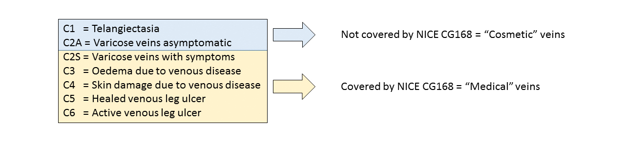C1 and C2A or cosmetic varicose veins are not covered by NICE. However, research exists showing that even these need to be treated as medical conditions, with all being scanned by a competent specialist as part of a team in a vascular service. Failure to do so would put any doctor and nurse involved into a position of potentially not acting within their competency and within the best interest of the patient.