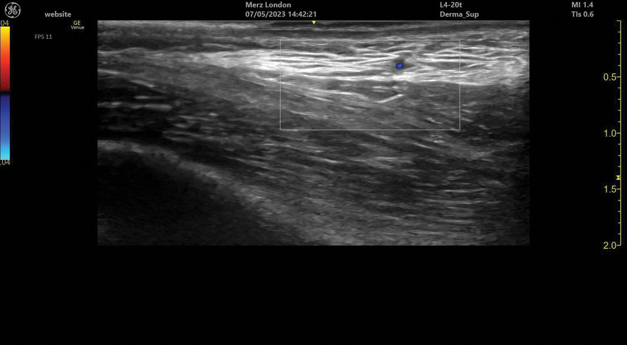 Ultrasound doppler can be used to assess blood vessel flow prior to treatments but can also help identify abnormalities in blood supply after filler treatment. Vessels can be identified and tracked in the tissue allowing for the observation of any anatomical variation. Blood vessels always appear as anechoic structures on ultrasound but, when using a colour doppler, flow can be detected either towards (red) or away (blue) from the ultrasound probe [1].