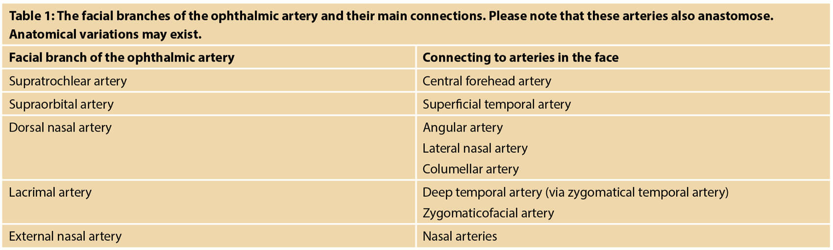 A thorough understanding of peripheral arterial anatomy is essential to reduce the risk of both retinal and peripheral ischaemia. General statements can be made concerning the expected anatomical layer and the general direction of the arteries. Detailed anatomy of the facial vasculature is described elsewhere [9].
