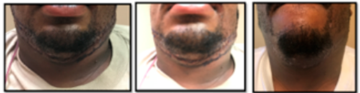 When we are confronted with a patient with a keloid we think is amenable to SRT treatments, we excise the keloid or work with a plastic surgeon who can do that excision for us. For three consecutive days, we perform SRT treatments on that excised keloid area. The radiation dose is calculated and delivered in three doses, or fractions, so as to limit the potential for any adverse effects, or radiation dermatitis that may be seen when giving large doses of radiation in one setting. Clinical trials have shown how effective this therapy can be and we have used this in numerous patients with, at times, amazing results. An example of SRT treatment on a keloid lesion is shown in Figure 5.