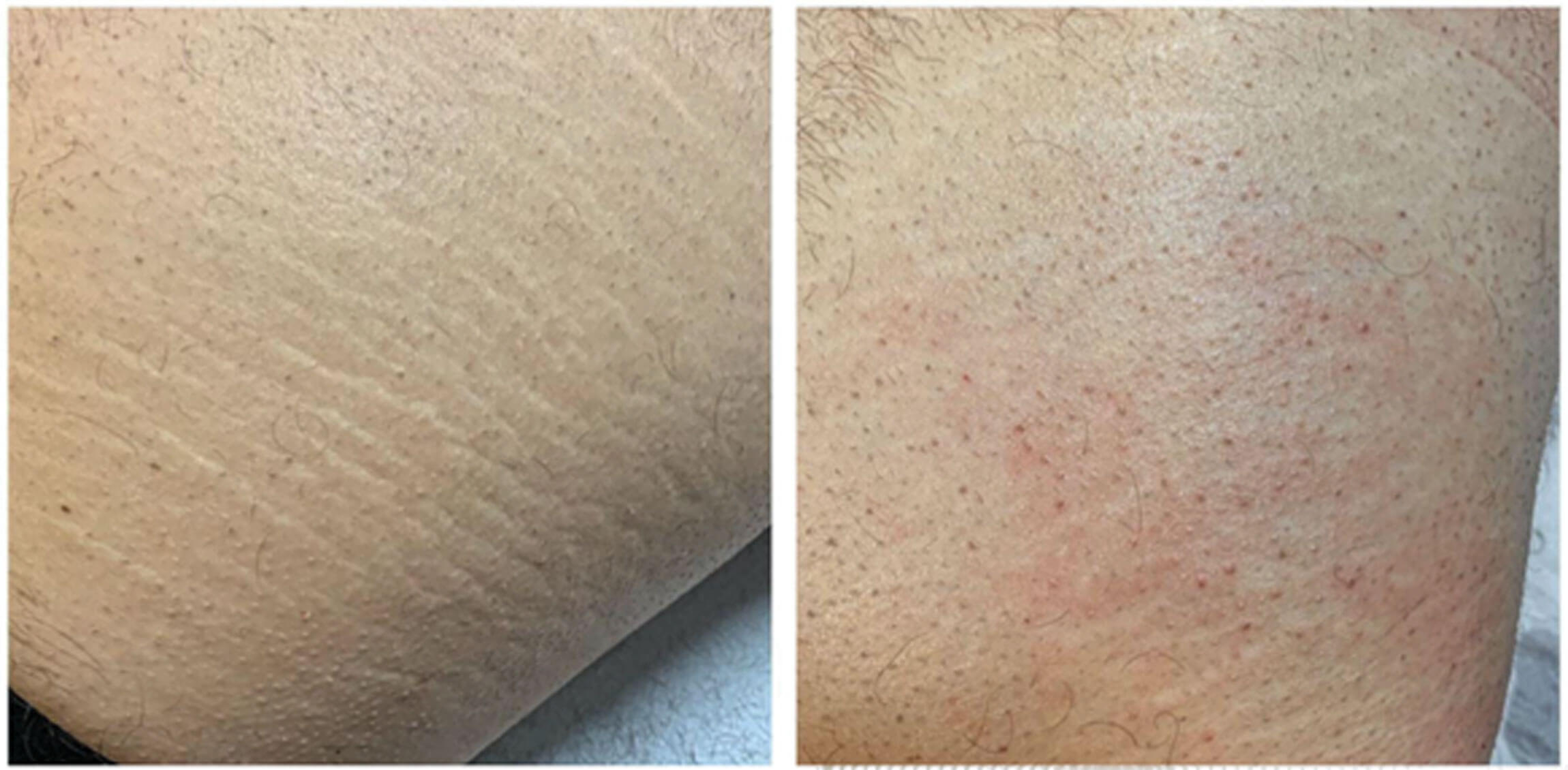 A 35-year-old male attended my private practice with SD on his buttocks. He requested to improve the appearance and the texture of the area. Clinically SD appear as multiple, symmetric, irregularly linear, atrophic scars that follow the lines of cleavage and lie parallel to the skin surface [5]. The patient reported that the blemish appeared during puberty. Before coming to my clinic, he had never undergone any treatment. The treatment plan was to biostimulate SD tissue with Revypeel High by MBE, a chemical peeling composed of Trichloroacetic Acid (20%), Kojic Acid (5-7%), Mandelic Acid (5-7%), which is pH 0.2-1%, and is suitable for all phototypes (I-VI) and skin types. Before treatment, we prepared the skin with a pre-peeling solution rich in ascorbic acid, citric acid, and lactic acid.
