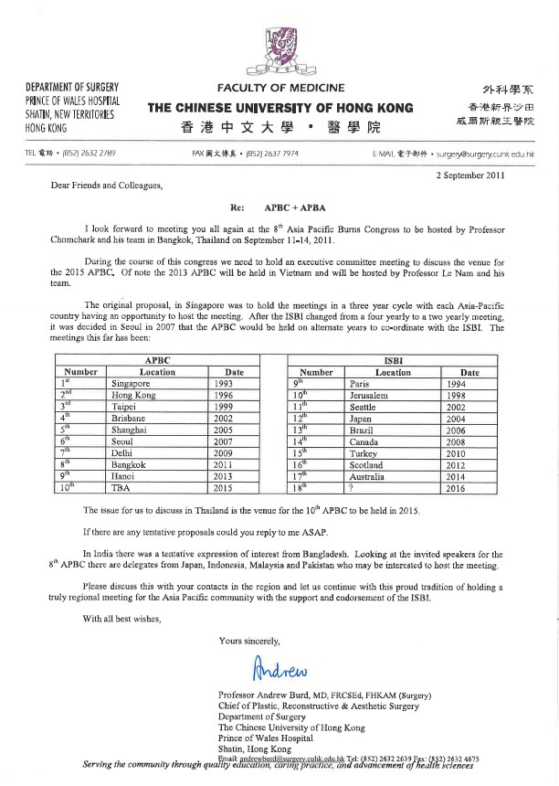 The 2003 APBC was held in Brisbane, Australia in conjunction with the Annual meeting of the Australia and New Zealand Burns Association. There had been no prior arrangement for the customary meeting of the Asian delegates to decide on the host of the 2005 APBC and so an ad hoc meeting was held. The representatives from the Asian countries had agreed informally that Shanghai should host the meeting but an unfortunate misunderstanding by the then President of the ISBI resulted in the statement that it was the ISBI who decided who should host the APBC causing considerable confusion and dismay amongst the Asian representatives. Robust and vigorous emails were exchanged and in a conciliatory move it was decided to hold an APBC business meeting in Yokohama at the 2004 ISBI meeting. At this meeting there was a unanimous decision taken by the Asian delegates to form a regional association. A poll (email and letter) was taken of over 1000 burns care professionals within the Asia Pacific region which also indicated strong support for a regional burns association.