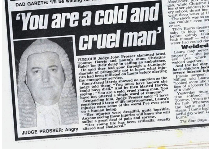 I think there was only one cold, cruel and sadistic man in that court and it was not the defendant. Justice Prosser would or should have known that he was sentencing this young man to death. If he did not die in the ‘criminal justice system’, that is the one run by the criminals, then the necessary solitude to ensure his physical safety would have destroyed his will to live and suicide would almost certainly follow. A young man of limited intelligence who had tried to do something to help and it all went very wrong. He had no idea what was going on. To be labelled a sadistic, evil killer is not a good reference for the British penal system. I do have some background on this because the instructing solicitor’s clerk went to school with Tommy and knew him to be a bit slow but completely harmless. Oh and Laura became my patient in Frenchay and was one of the children who benefited from my pioneering use of tissue engineered skin in scar reconstruction. Small world.
